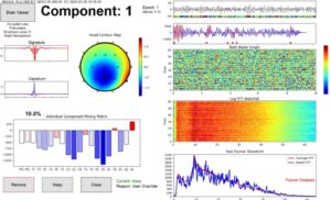 Rather than analyzing the EEG using strictly Fourier methods, which reduces the signal to a set of frequencies, this method takes advantage of ICA as a reverse source localization method which removes volume conduction. We think of the EEG as a series of events, not a simple vibration. Each component has a mixture of frequencies, and its own fingerprint or “signature.” These signatures are thought to occur in the EEG on an intermittent basis, providing more of a series of chirps than a frequency.