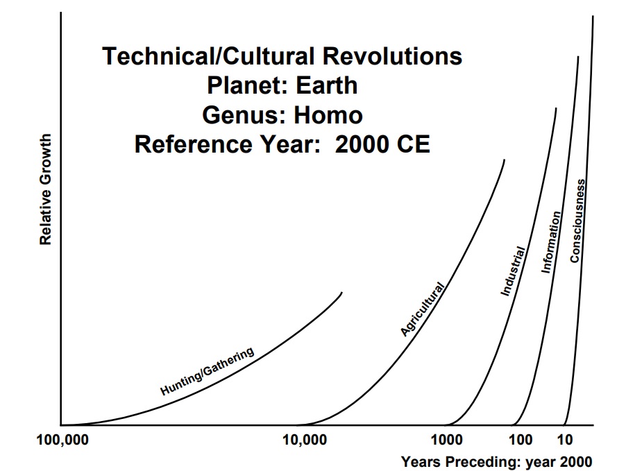 Where are we headed? What is the future of the human experience? How do the previous 10, 100, 1000, or 100,000 years relate to our ongoing journey? In particular, where do consciousness, the brain, the mind, and neurofeedback fit into the big picture? In order to look forward, it is instructive to look back, and to view our work in the context of our historical and anthropological development. Suppose an anthropologist visits earth from another planet, and is assigned the task of making a brief summary of human technical and cultural development, up to the current time. Something like the following graph might result.