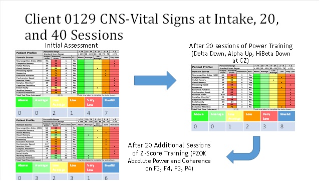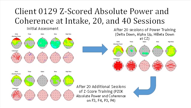 As an example, the following results were achieved after 20 sessions of conventional power training, followed by 20 sessions of 4-channel ZNF training. The ZNF clearly addressed important connectivity concerns, and resulted in significant neurocognitive improvement, which was not evident from the power training sessions. As a result, the ZNF produced significant behavioral and mood improvement in this client.